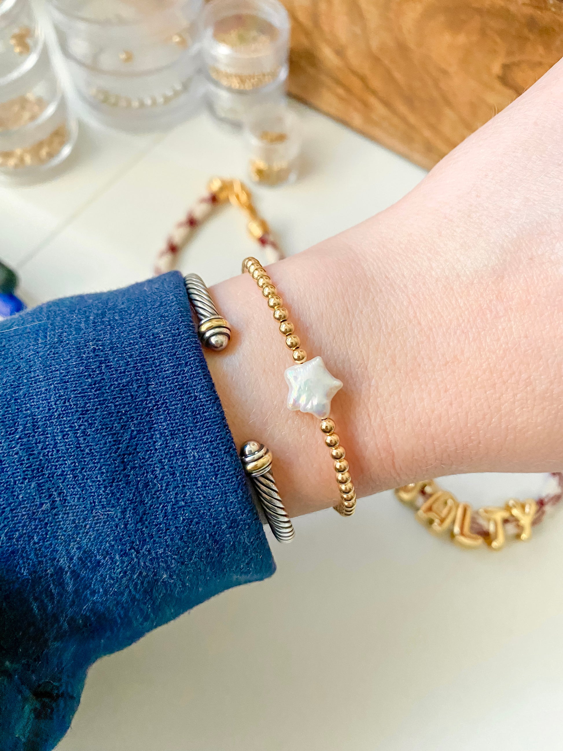A 3mm 14k Gold Filled or Sterling Silver beaded bracelet measuring 6 inches with a one inch extension chain, or made with a stretch cord that can be rolled on and off the wrist. If you have a special request regarding the length please message us. This is for one bracelet.