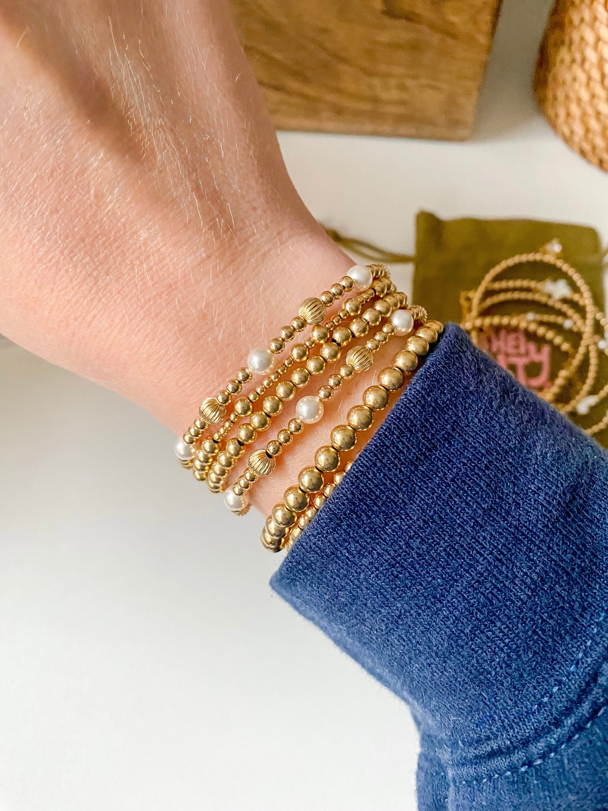 A 3mm 14k Gold Filled or Sterling Silver beaded bracelet mixed with 5mm corrugated beads & pearls measuring 6 inches with a one inch extension chain, or made with a stretch cord that can be rolled on and off the wrist. If you have a special request regarding the length please message us. This is for one bracelet.