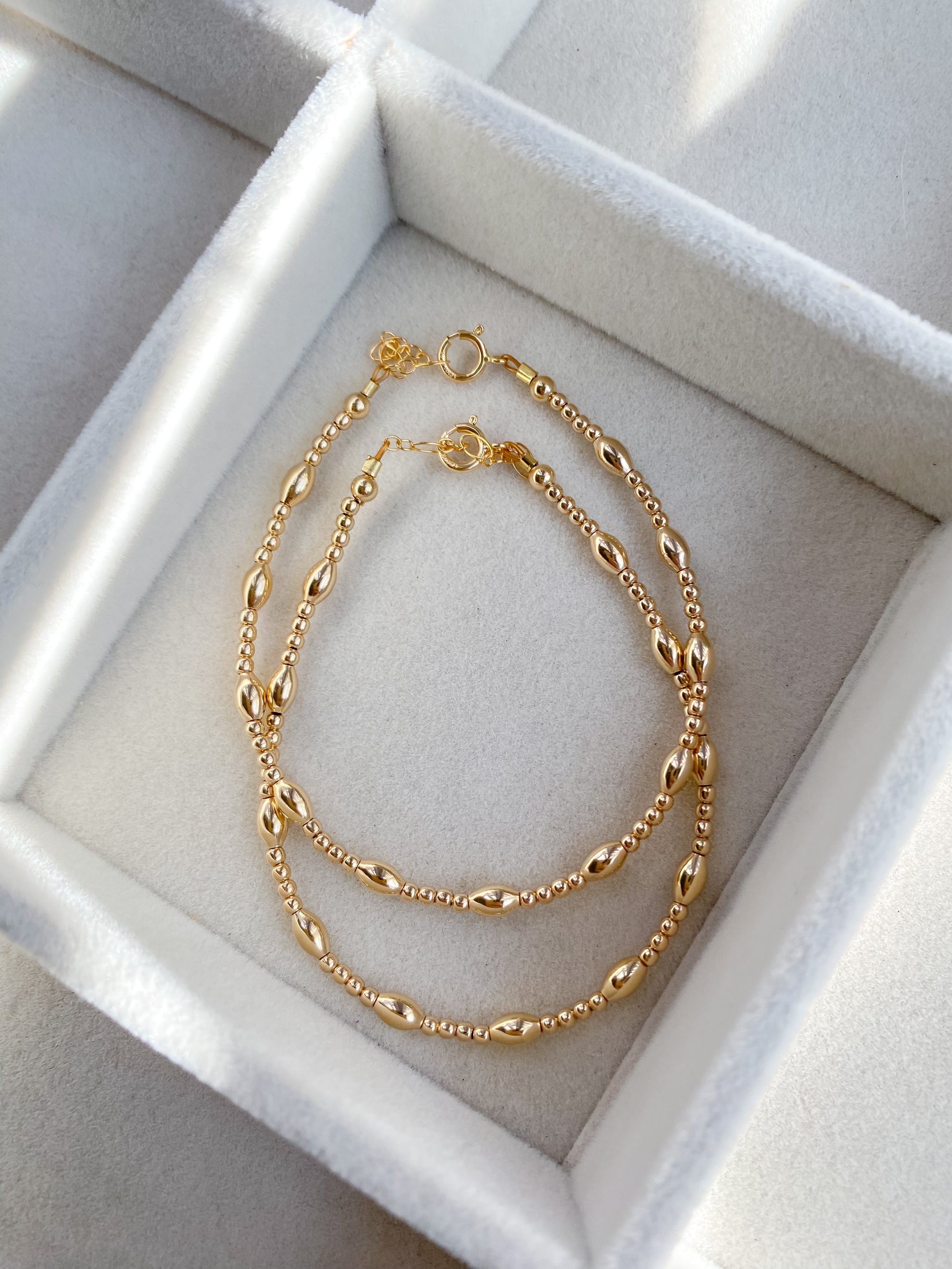 A 14k Gold Filled beaded bracelet measuring 6 inches with a one inch extension chain, or made with a stretch cord that can be rolled on and off the wrist. This bracelet is made with 2mm round beads & 5mm oval beads. If you have a special request regarding the length please message us. This is for one bracelet.